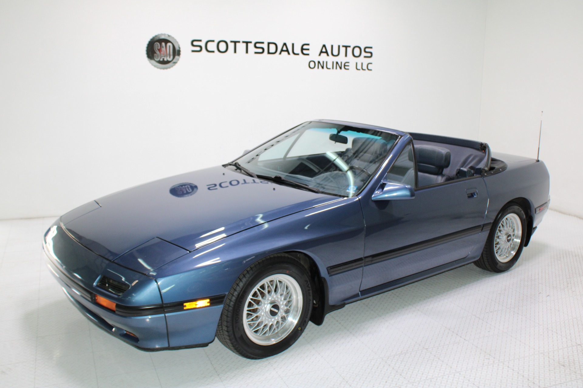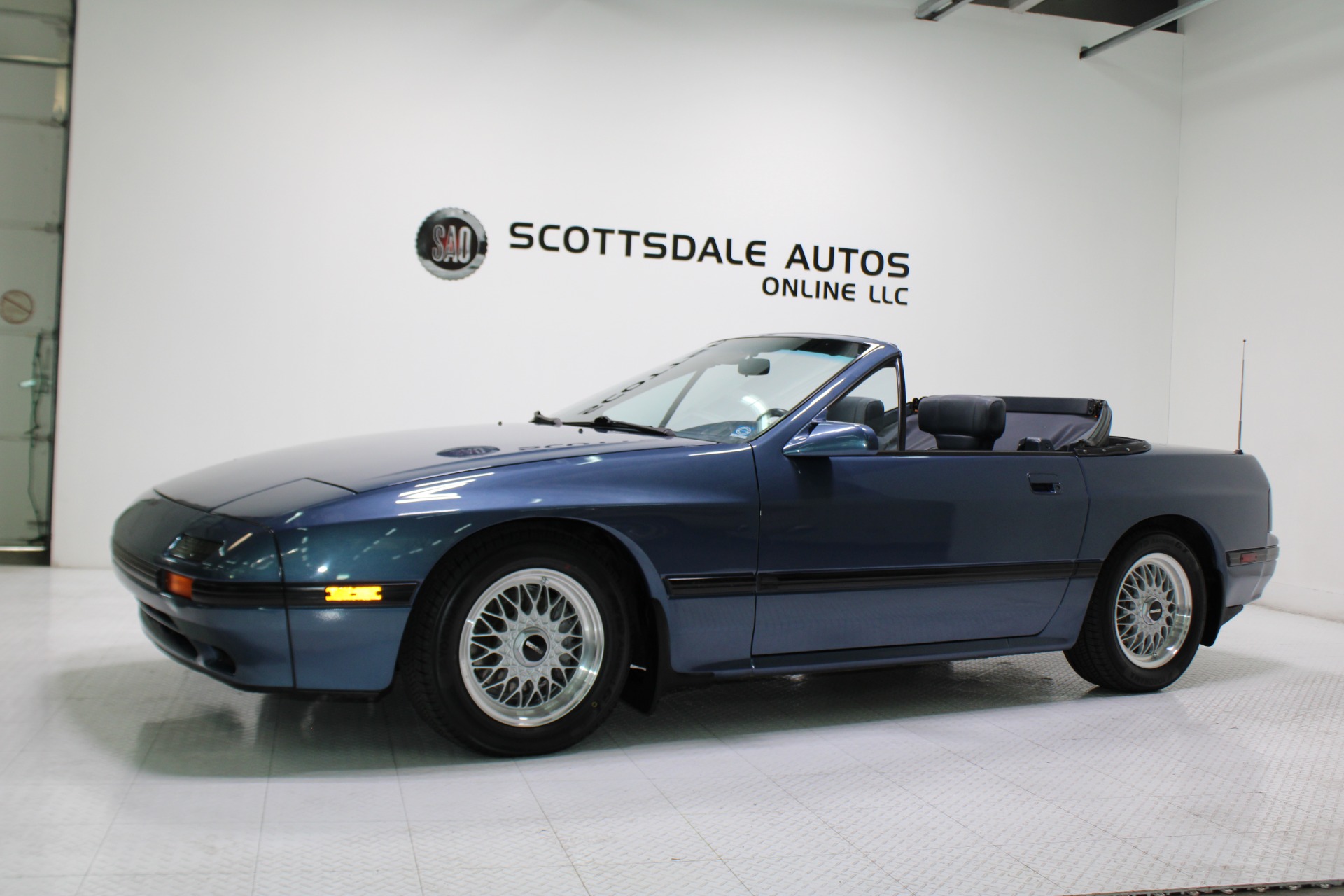 Experience the thrill of driving with this classic 1988 Mazda RX-7 Base Convertible, a true icon in automotive history. This timeless beauty is dressed in an eye-catching Sapphire Blue Metallic finish that gleams under the sun, making it impossible to go unnoticed. The sleek lines and aerodynamic design capture the essence of sporty elegance, while its convertible body type promises endless adventures on open roads with the wind in your hair.